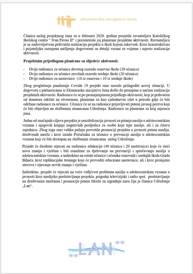 Udruženje „Lan“ iz Bihaća od 1. 2. do 30. 6. 2020. godine realizira projekt „Ko se tuče, taj se ne voli“. Projekt […]