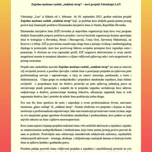 Udruženje „Lan“ iz Bihaća je od 1. februara do 31. oktobra 2022. godine realiziralo projekt Zajedno možemo razbiti „stakleni strop“ koji je podržan kroz dodjelu granta putem javnog poziva koji finansijski podržava Ekumenska inicijativa žena iz Omiša, Republika Hrvatska.